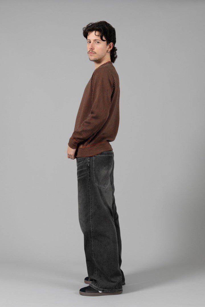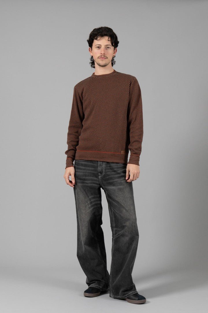 Jersey de hilo reciclado con estampado de cuadros pequeños en el cuerpo y rayitas en mangas, cuello redondo.
