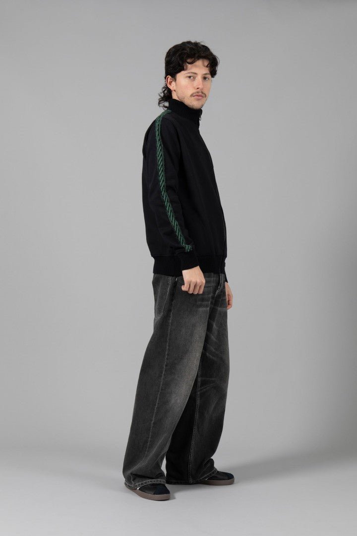 Sudadera de felpa negra con cremallera y bolsillos. Tira de punto en las mangas.