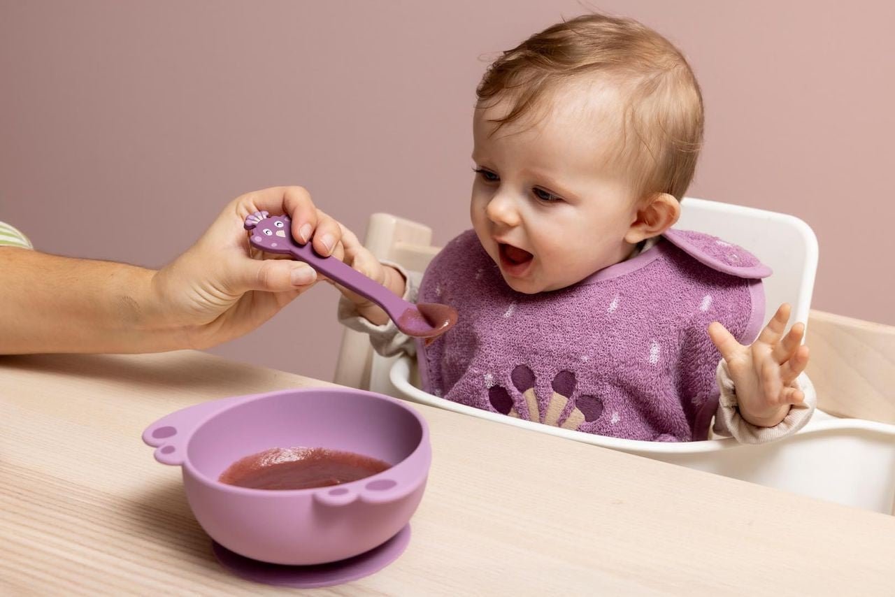 Esta cuchara es perfecta para alimentos sólidos. Las cucharas también funcionan muy bien para que los niños aprendan a comer solos. Dentro de la cuchara, hay una parte de acero inoxidable integrada para mantenerla fuerte y recta. Por lo tanto, este artículo es una excepción y no se puede poner en el microondas.
