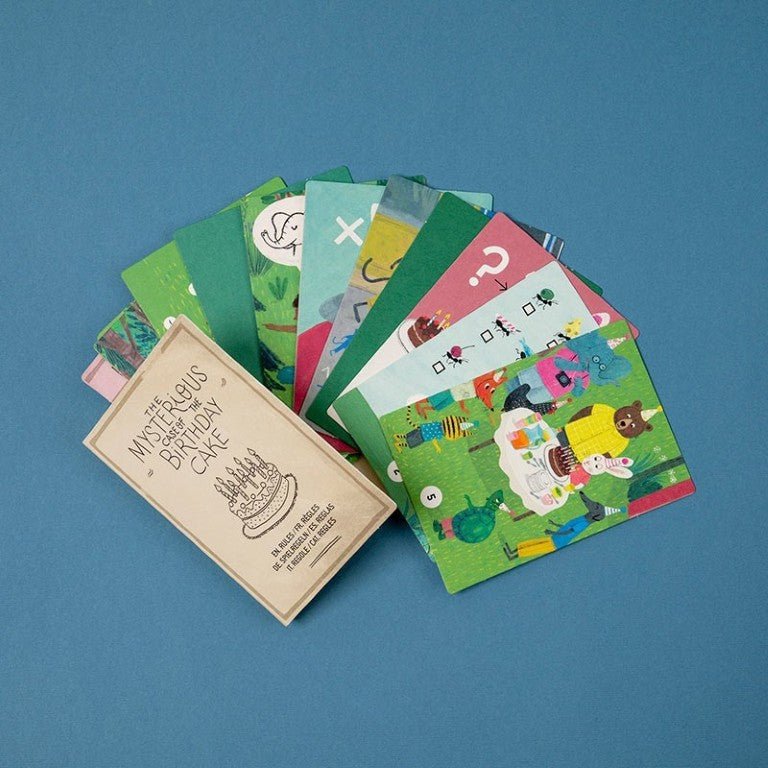 Un puzzle de 100 piezas con un juego de detectives. Incluye 15 cartas de deducción para resolver el misterio del pastel de cumpleaños. Un puzzle original con juego de pistas.