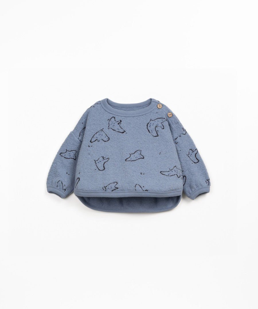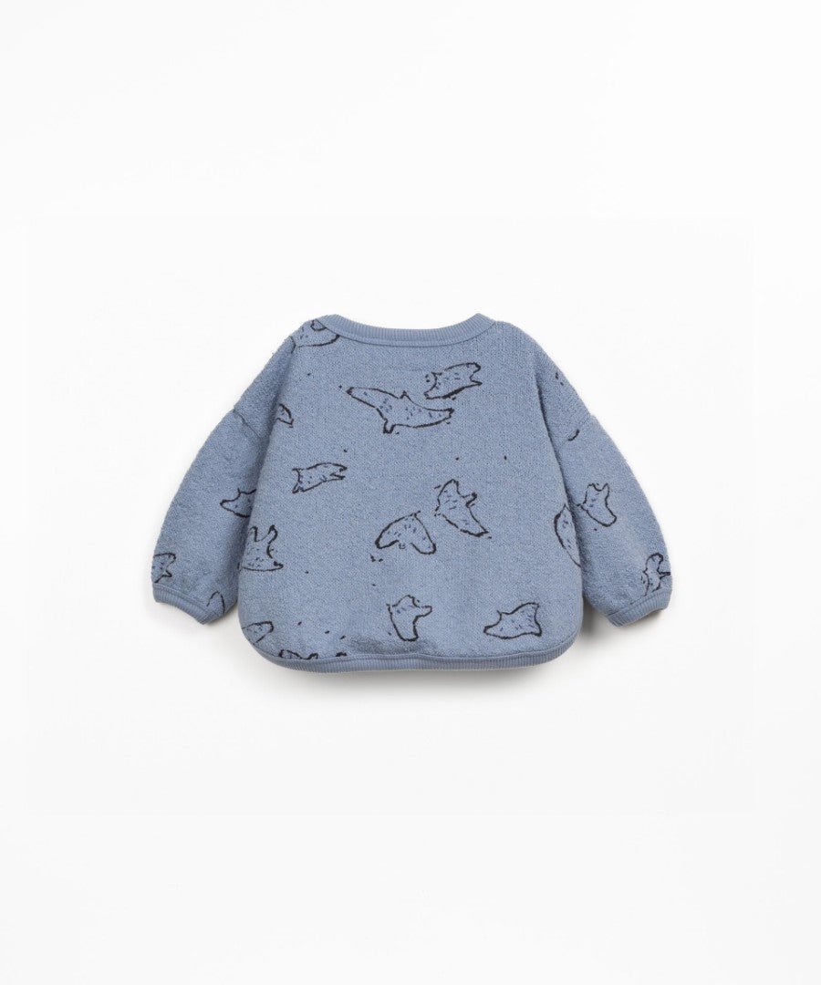 Este jersey está confeccionado en punto con una mezcla de algodón orgánico y algodón regenerativo, en color Azul. Es un modelo de manga larga, escote redondo, abertura en el hombro con botones de coco y nuestro estampado de pájaros.