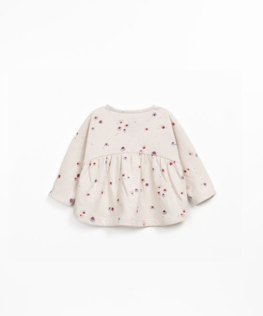 Esta camiseta está confeccionada en punto con una mezcla de algodón orgánico y algodón reciclado, en color Blanco Medio. Tiene mangas largas, interior afelpado, abertura frontal con botones de coco, una parte trasera ligeramente más larga y nuestro estampado de arándanos.