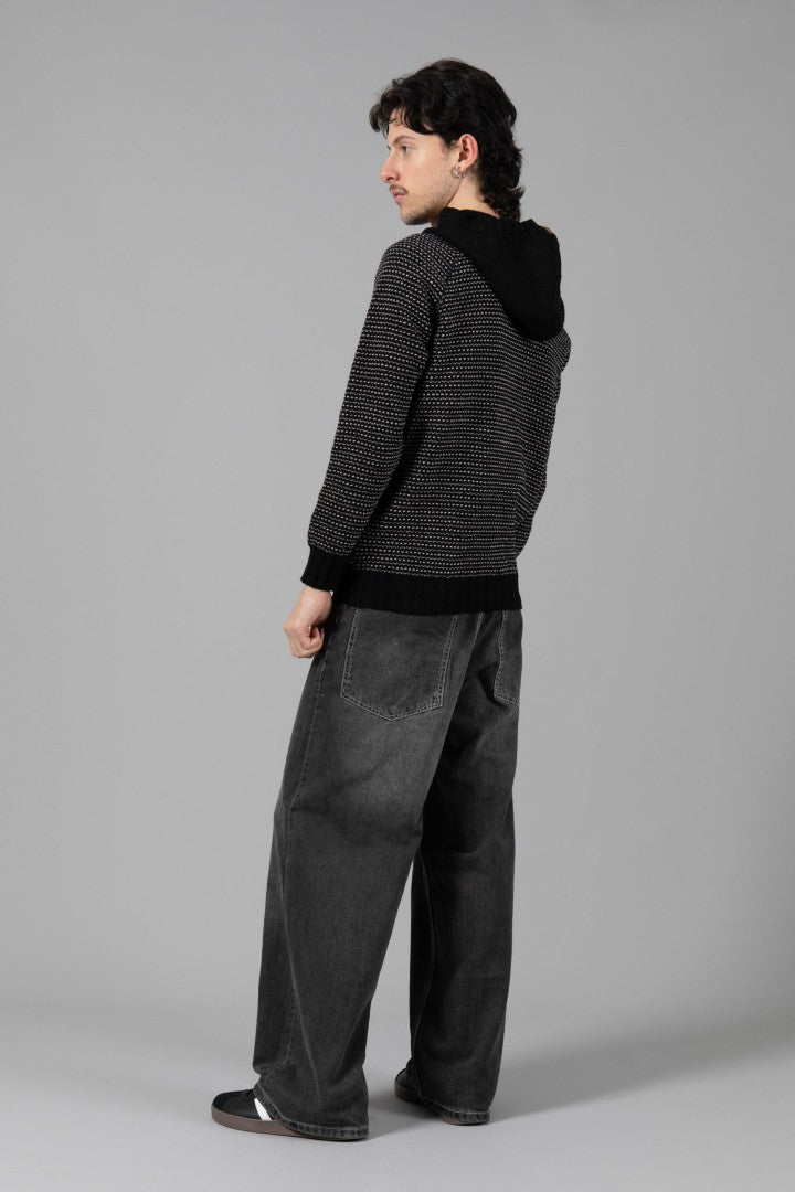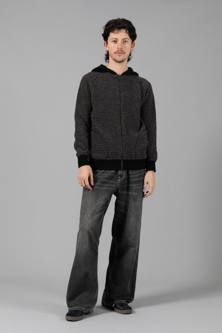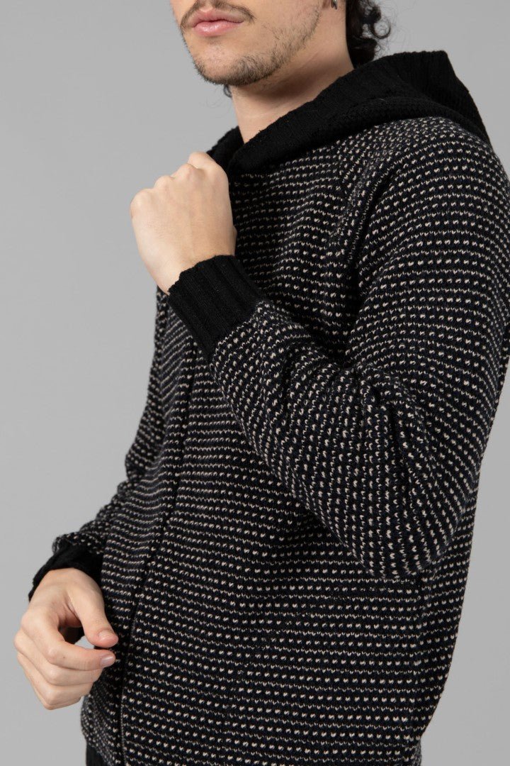Jersey de hilo reciclado con capucha, cremallera y bolsillos.