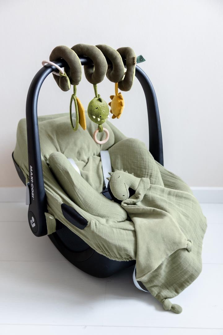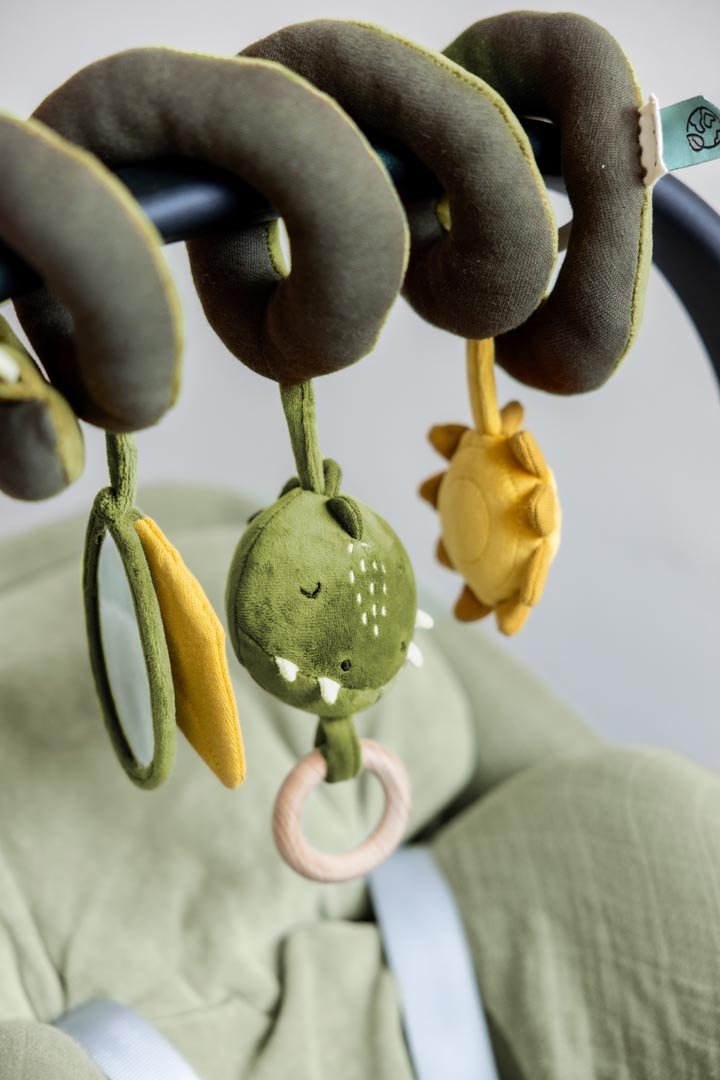 Con numerosos elementos divertidos que descubrir, esta espiral de actividades hará las delicias de tu peque, y puede enrollarse sin problemas en cualquier parquecito o silla de paseo. Cada uno de sus tres juguetes tiene características diferentes, como un anillo de madera, tejido con sonidos crujientes al tacto, un espejo y mucho más, que mantendrán a tu bebé entretenido allá donde vayas. Además, todos los elementos se sujetan con un práctico anillo de juguete, por lo que podrás desengancharlos fácilmente para continuar la diversión fuera del parque o la silla de paseo.