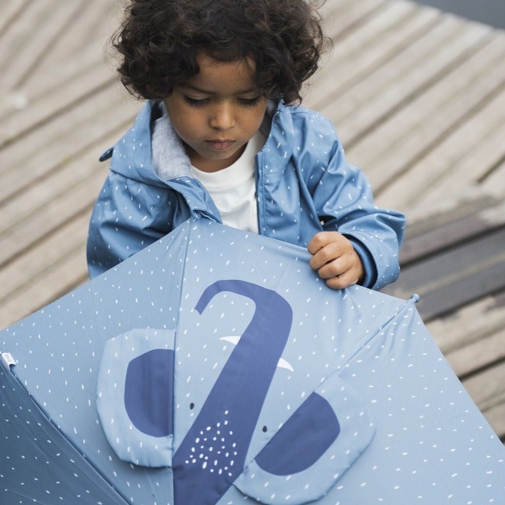¡Disfruta de la lluvia con nuestras sombrillas alegres de animales hechas de material reciclado! ¡Un día gris cambia instantáneo de color con estos amantes de animales alegres a tu lado! Mantente seco bajo el paraguas de tu animal favorito. ¡Sus orejas de soplillo revolotean felices cuando saltan en los charcos y bailan bajo la lluvia! Las paraguas están hechas de poliéster 100% reciclado. El sistema deslizante para abrir y cerrar el paraguas está especialmente diseñado para las manos de los niños, de modo que los niños puedan usar el paraguas de manera segura y suave. El paraguas tiene una armadura de aluminio fuerte, de alta calidad y muy ligero. Cuando el sol vuelva a brillar, ¡puedes recoger el paraguas con la cola del animal!