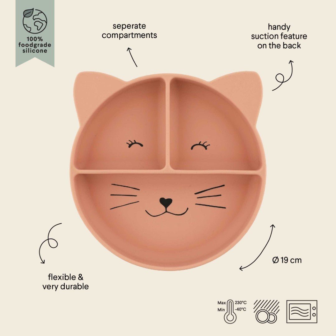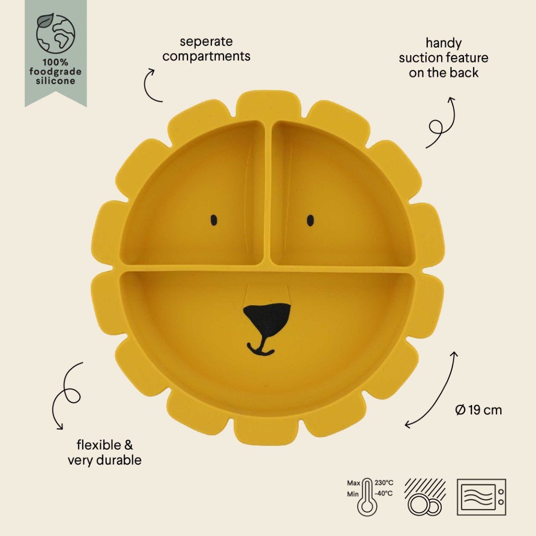 La hora de la comida será más divertida que nunca con la compañía del amigo animal favorito de tu pequeño. No se trata sólo de una simpática carita, sino también ofrece una práctica ventosa que permite que el plato se adhiera a cualquier superficie lisa, evitando que se caiga. Además, este plato se compone de varios compartimentos para ayudar a los niños a diferenciar alimentos, sabores y texturas. Fabricado en silicona 100%, es suave al tacto, no se rompe al caer y es apto para microondas, horno, congelador y lavavajillas.