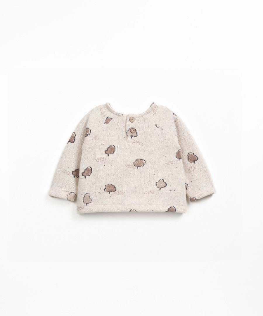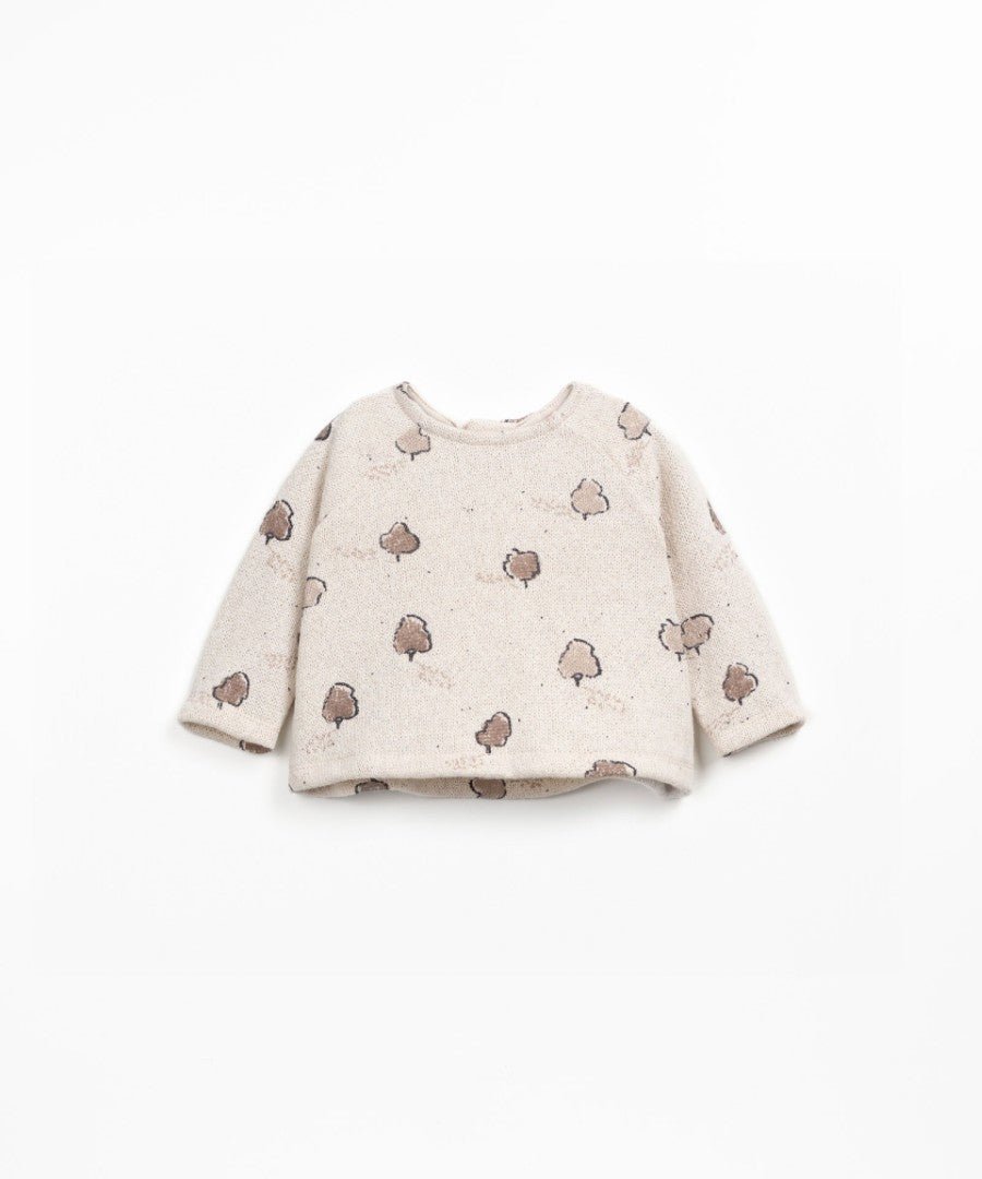 Este jersey está confeccionado en punto con una mezcla de algodón regenerativo y algodón reciclado, en color Blanco Medio. Es un modelo con manga larga, cuello redondo, apertura trasera con botones de coco y nuestro estampado de árboles.